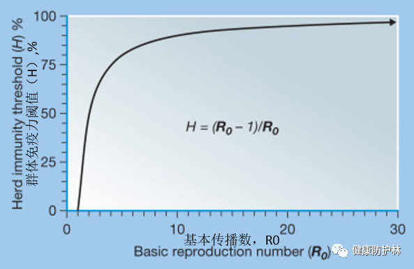 3.群体免疫力要多高才能阻止新冠病毒流行?还记得R0吗?基本传播数,就是在自然情况下,一个传染病患者平均可以传染的人数。很显然,R0越高,传播力越强,要构建的群体免疫力比例就要越高。初步的计算公式见下图。