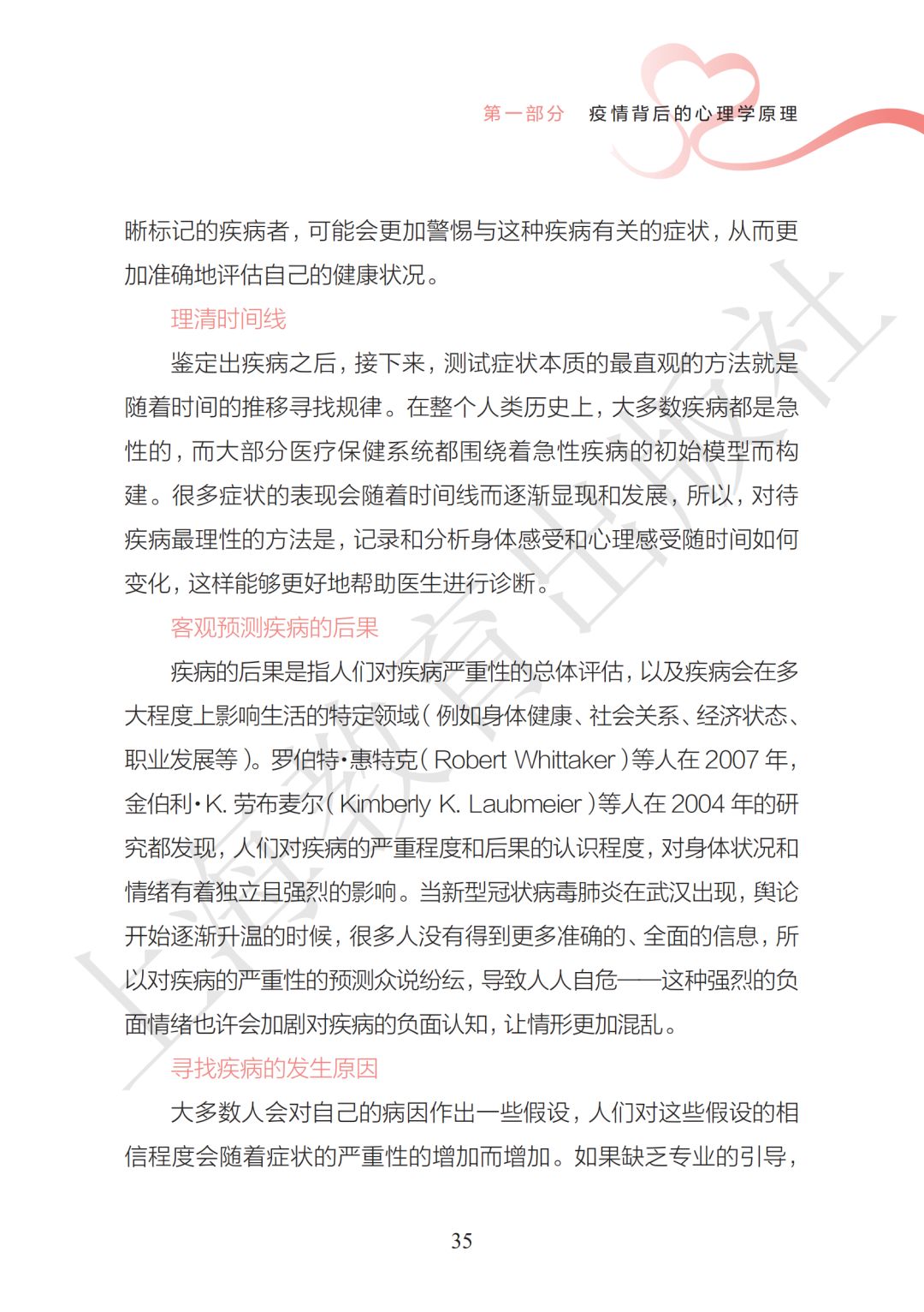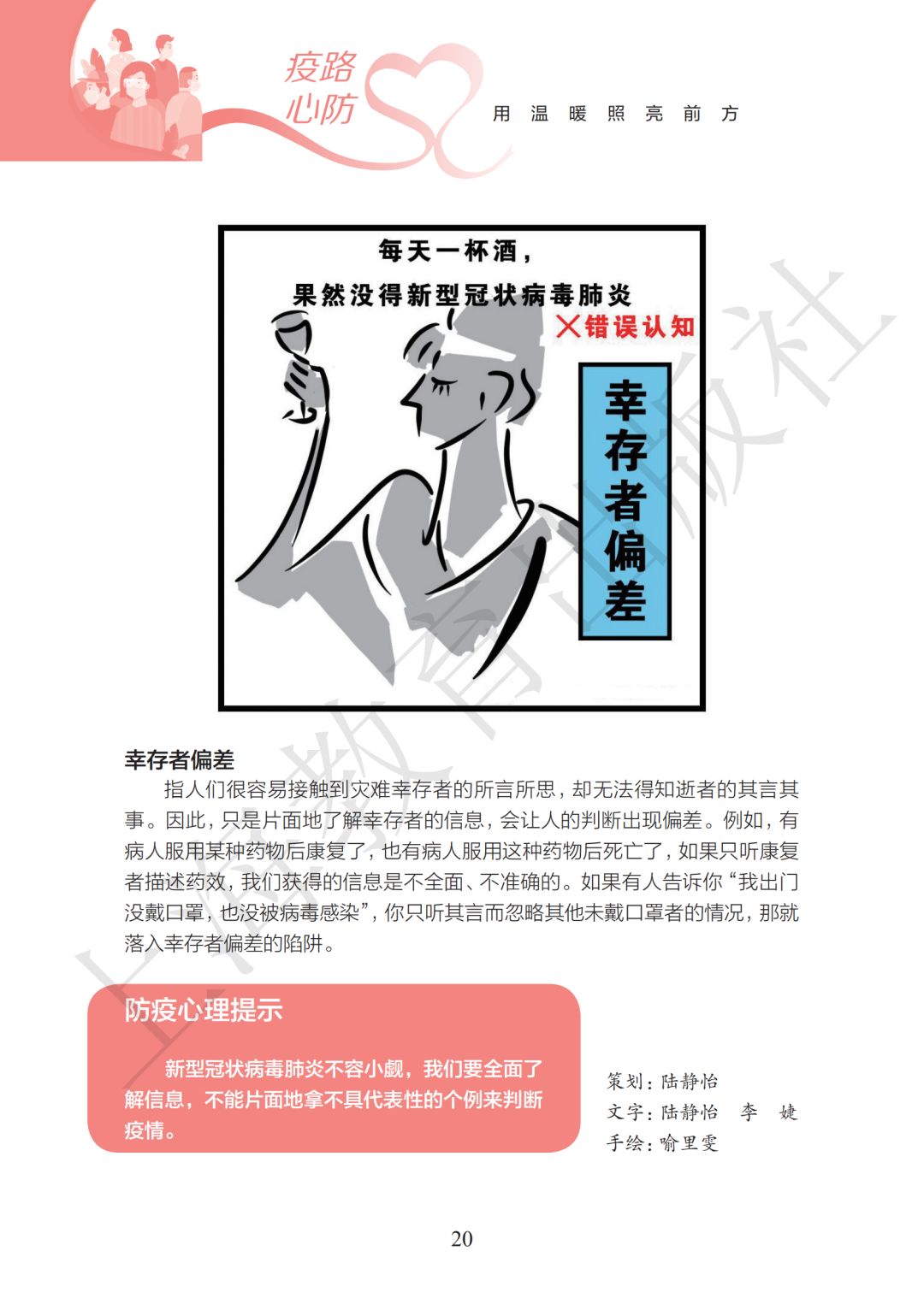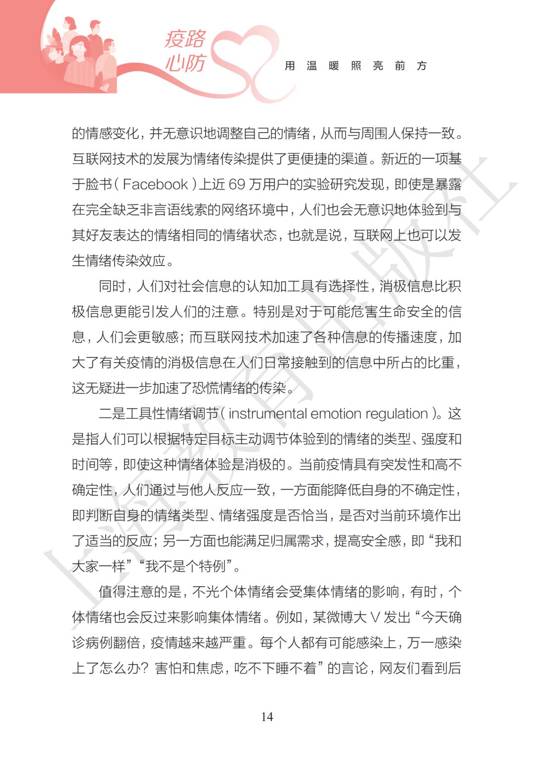 内容包含:如何理性感知疾病,更好应对疫情;恐慌为何“传染”,如何应对恐慌;疫情带来的角色转换与应对;克服恐惧和焦虑的建议;如何和孩子解释这场没有硝烟的病毒大战;危机中的相互守望,等等。