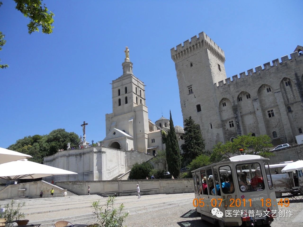 阿维利翁在法国南部普罗旺斯地区的沃克吕兹省,距马赛约85公里。其城建于公元14世纪,城长5000米,至今保存完好。市内古迹众多、车辆甚少,居民悠闲、古风扑面。我们到达时约上午10时许,路上行人稀少,著名的梧桐大道两旁梧桐高耸,应是正宗的法国梧桐了。商店方始开门,只路边市场稍有人气,所售之物多为蔬菜、水果、鲜花之类,並见一画家,身穿休闲之服,头戴法兰西帽,边作小幅水彩画,边售其作品,虽无人问津,但仍作悠然自得之状,谅必衣食无忧,大约並不靠卖画为生。