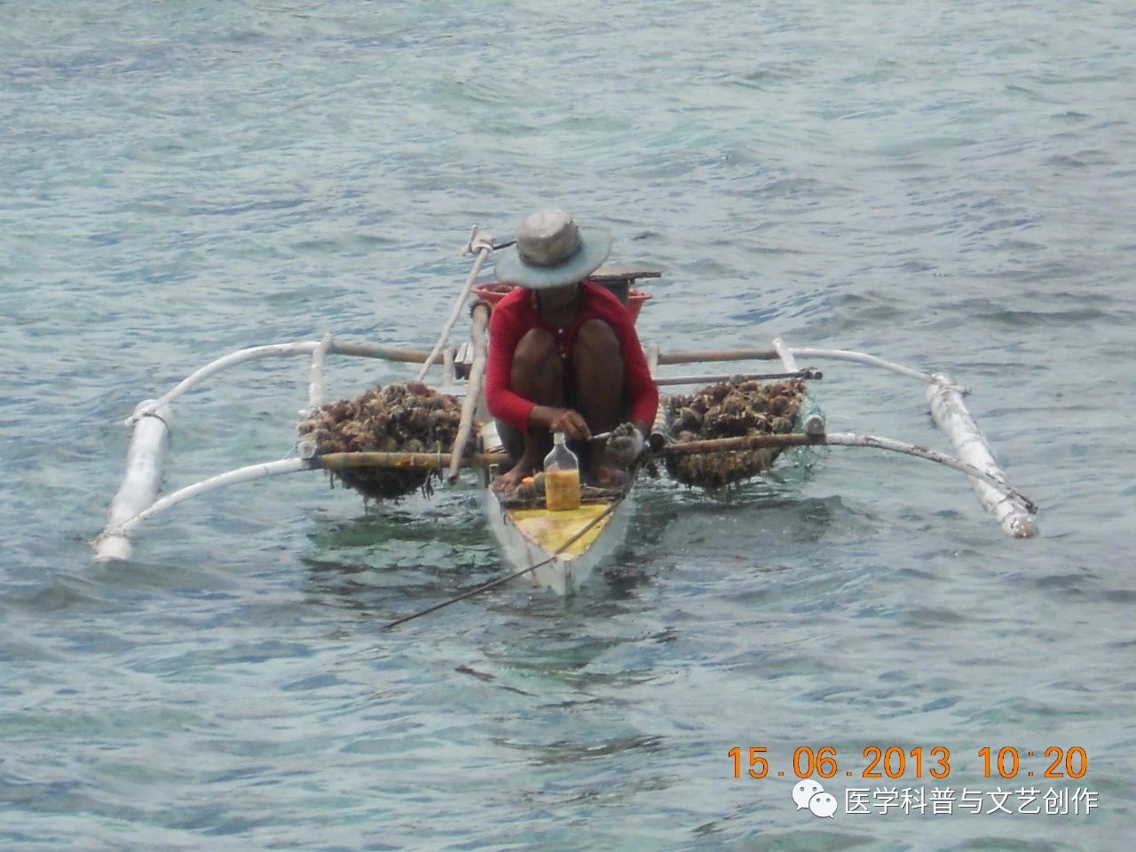 次日乘船出海,所乘之船却颇为奇特,船身狭长,自是为了减少航行之阻力,船之两侧皆有横杆各4支伸出丈许,其末皆有浮筒相连,因之其船状若8足之蟹,故人皆称之为螃蟹船。不但如我们乘坐之机动船如此,小至两人划行的小木船两旁亦伸出足来。两侧有浮筒之船大约肯定是不会翻身的了,但是调头转向肯定不灵,有得必有失,也是世间的规律。菲律宾为岛国,各岛之间为内海,谅也不致于有过大风浪,何以此处独有此奇特之船?