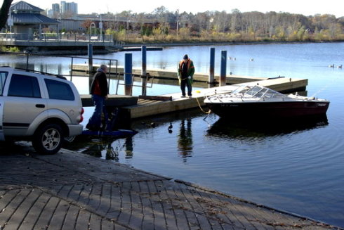 | 两个退休老人犁波破浪以后, 正将自己的游艇拖回家去…… |