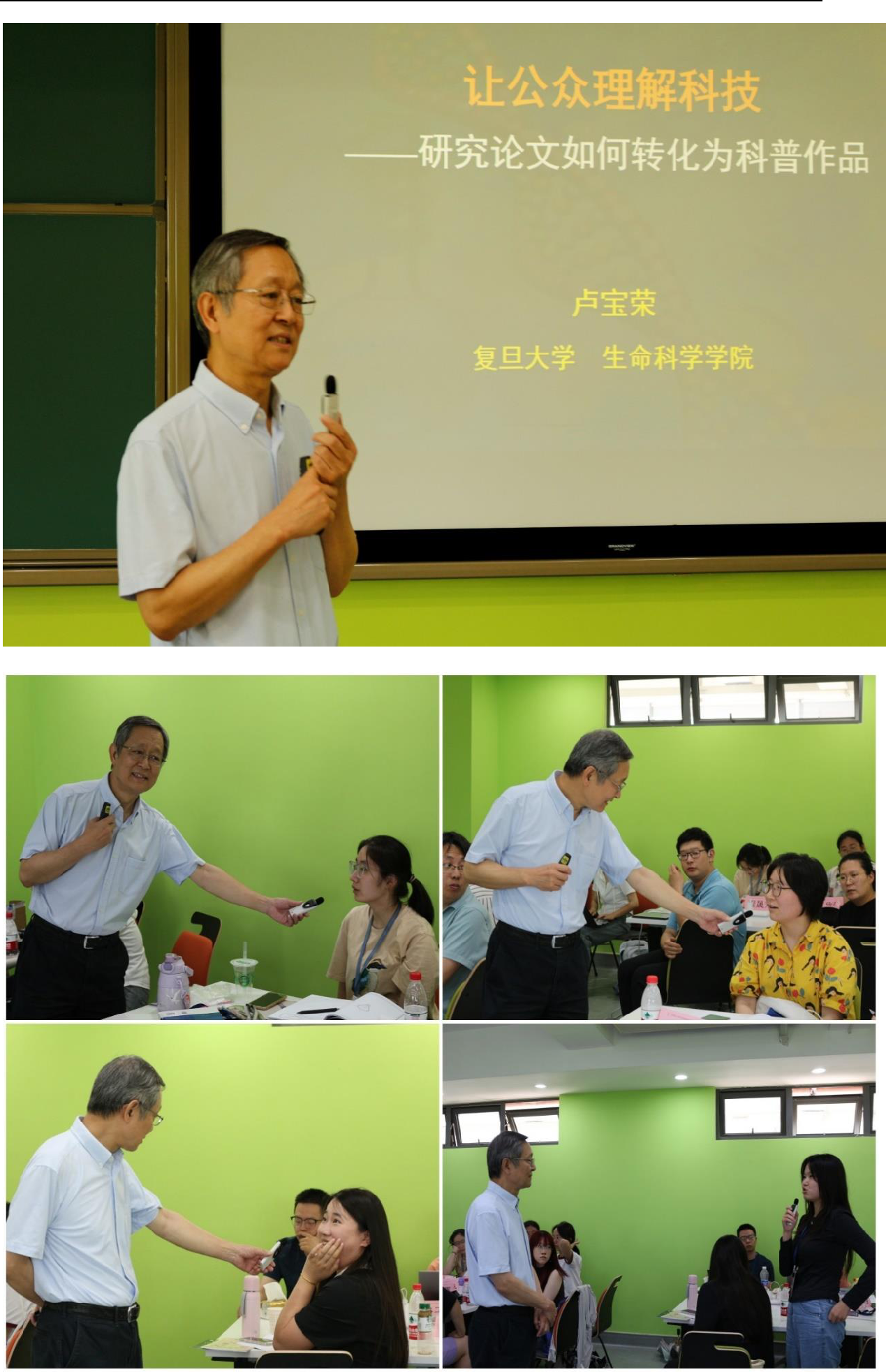 今天是第十六届科普创作培训班的开幕日,我们有幸聆听了裴新宁教授和卢宝荣教授的精彩报告。